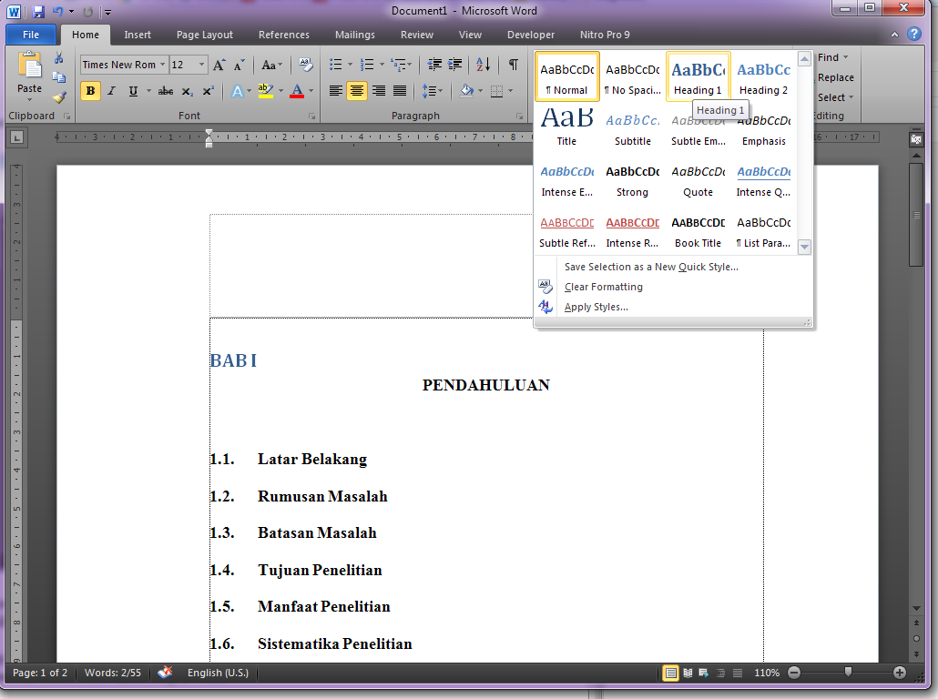 Sekarang, agan harus tau mana yg mau di masukin daftar ini, disini saya mau masukin yg pertama BAB 1. cara nya, blok Tulisan "BAB I", lalu pada menu Tab Ribbon Home, bagian Styles pilih Heading 1 sebagai level tertinggi.
